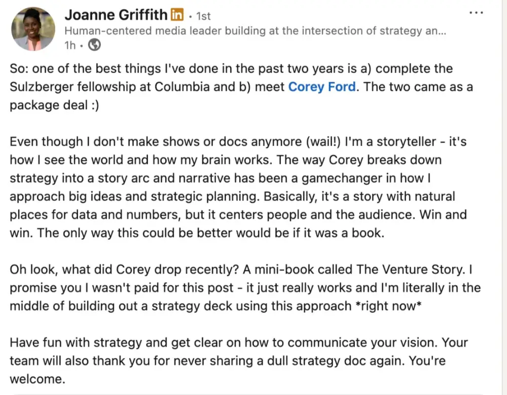 Working with Corey was a turning point in my career. As director of the Sulzberger Executive Leadership Program at Columbia, Corey helped guide me through one of the most transformative professional experiences I’ve had. Later, through one-on-one coaching, he played a key role in helping me find the clarity (and courage) to launch (and persevere with) Project C, my independent initiative to support creator-model journalists. Corey brings an extraordinary mix of strategic insight, emotional intelligence and entrepreneurial energy to every conversation. He doesn’t just ask great questions – he helps you hear your own answers more clearly. If you’re navigating a major transition, building something new, or trying to reconnect with your purpose as a leader, I can’t recommend Corey highly enough!