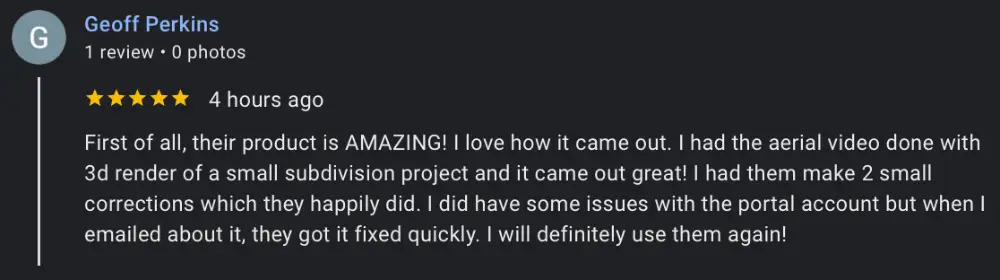 Very professional looking video! The video came back very fast and I was able to make requests for changes. I will more than likely be returning! Thanks again!