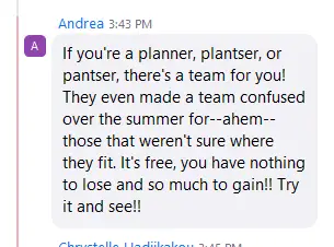 I appreciated all the advice and coaching that was given on each team as I couldn't make up my mind which team to join. I finally settled on Planner for Fall as I want to see what planning would be like for my writing.