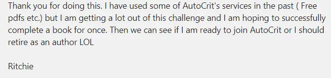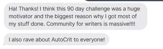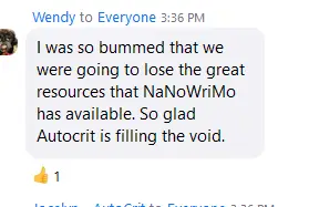 I had joined the AutoCrit community earlier this year, but I really didn't know how to use the tools, when I joined Novel 90, it really helped me learn about the tools in AutoCrit, how to get help, and how to get involved in the community.