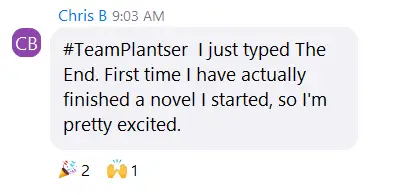 I loved the setup for Novel90. I was team plantser so Bekah was my coach and she was awesome. Love the coaching meetings and the occasional sprints. I started the challenge off strong but then work got crazy so fell off the wagon.