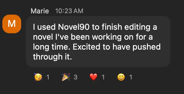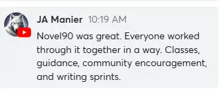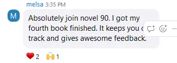 I'd like to end this testimonial by leaving a link to my blog with my experience of the challenge: justkatherineblog.wordpress.com/2025/08/22/i-completed-my-first-novel90-my-experience-and-a-review-of-the-challenge Everyone should try Novel90!