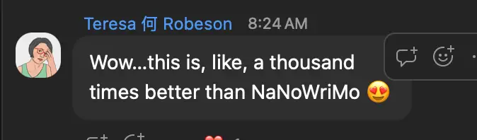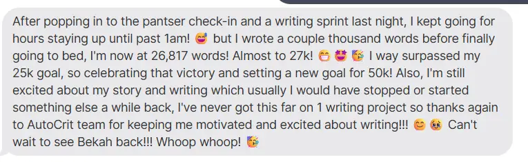 My goal was to progress as far as I could through the process. I knew from the start that I wouldn’t have enough time to complete the challenge. The best aspect of Novel 90 is its flexibility; being able to choose a team that aligns with my writing process, along with a tailored structure for each group, is incredibly beneficial. I believe fellow authors should participate because writing together and cheering each other on creates a joyful momentum for our writing sessions. The published authors who guide us provide invaluable insights into the writing process and publishing industry. I especially appreciate that the autocrit team is understanding of introverts and allows us to lurk and learn 😎