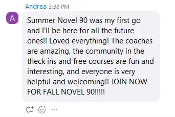 My goal going into Novel 90 was to get my writing spark back and try to figure out a writing practice that worked for me. Novel 90 got me writing again, and the support from the coaches was invaluable as I worked toward my goal. Whatever your author goal is, this challenge will help you grow in your craft.