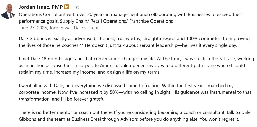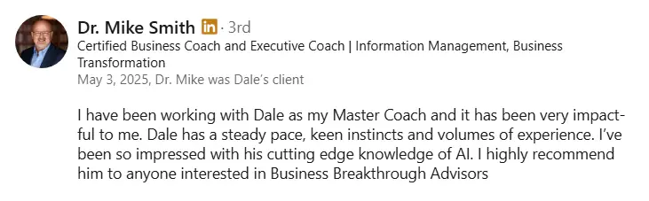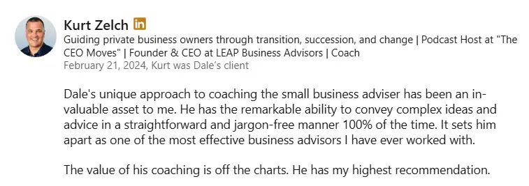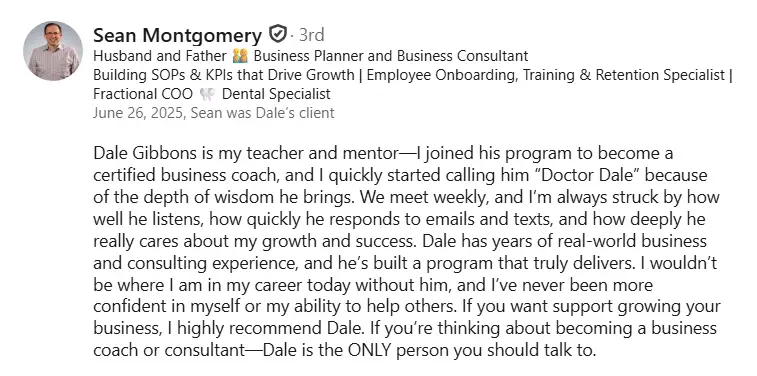 Dale was a huge find for me! Although I had almost 30 years as a business owner under my belt, 20 of that consulting, Dale opened up some new thinking for me. I faced the typical, consultant becomes an employee mentality, that many business owners place on consultants after working with them for some time. Through Dale's mentorship and group calls I was able to implement a number of 'gems' that have enabled me to retain client fees of $20,000 per month and more. I would highly recommend engaging Dale to anyone who is looking for learning curves, growth strategies and stronger sales.