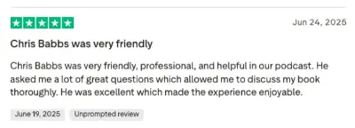 Chris Babbs was very friendly, professional, and helpful in our podcast. He asked me a lot of great questions which allowed me to discuss my book thoroughly. He was excellent which made the experience enjoyable.