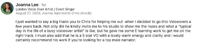 I just wanted to say a big thank you to Chris for helping me out when I decided to go into Voiceovers a few years back. Not only did he kindly invite me to his studio to show me the ropes and what a “typical day in the life of a busy voiceover artist” is like, but he gave me some E learning work to get me on the right track. I must also add that he is a 5 star VO with a lovely warm energy and clarity and I would certainly recommend his work if you’re looking for a top male narrator.