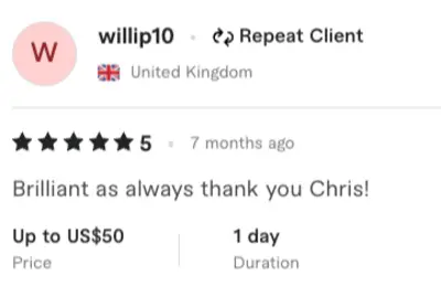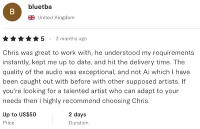 Chris was great to work with, he understood my requirements instantly, kept me up to date, and hit the delivery time. The quality of the audio was exceptional, and not Ai which I have been caught out with before with other supposed artists. If you're looking for a talented artist who can adapt to your needs then I highly recommend choosing Chris.