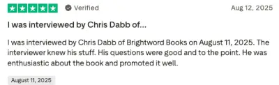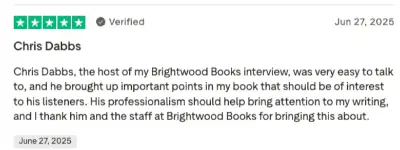 I was interviewed by Chris Dabb of Brightword Books on August 11, 2025. The interviewer knew his stuff. His questions were good and to the point. He was enthusiastic about the book and promoted it well.