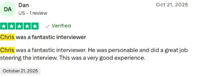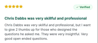 Chris Dabbs was very skillful and professional, but I want to give 2 thumbs up for those who designed the questions he asked me. They were very insightful. Very good open ended questions.