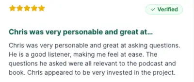 Chris was very personable and great at asking questions. He is a good listener, making me feel at ease. The questions he asked were all relevant to the podcast and book. Chris appeared to be very invested in the project.