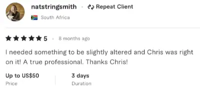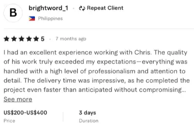I had an excellent experience working with Chris. The quality of his work truly exceeded my expectations—everything was handled with a high level of professionalism and attention to detail. The delivery time was impressive, as he completed the project even faster than anticipated without compromising…