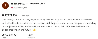 Chris truly EXCEEDED my expectations with their voice-over work. Their creativity and attention to detail were impressive, and they demonstrated a deep understanding of the project. It was hassle-free to work with Chris, and I look forward to more collaborations in the future. 👍