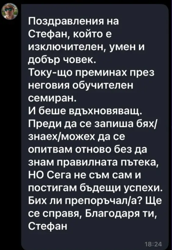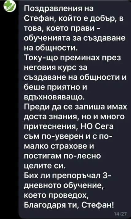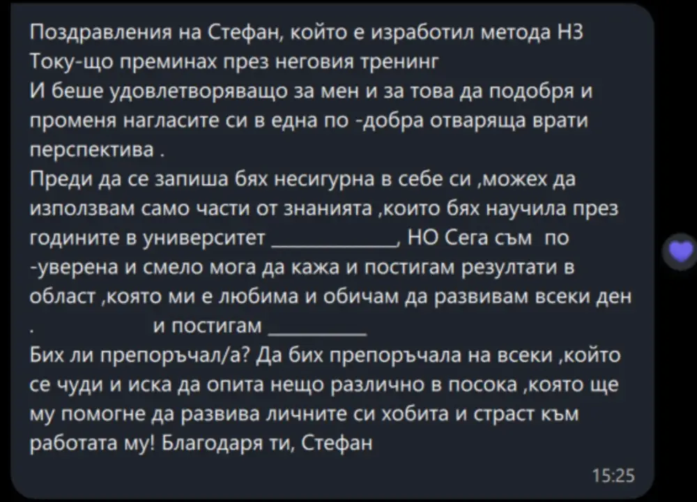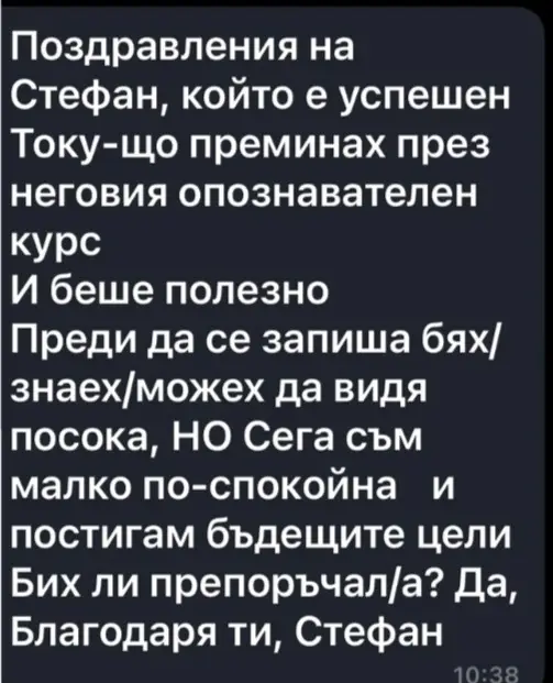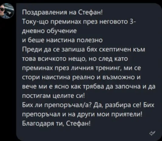 Поздравления на [СТЕФАН], който е добър учител и мотиватор. Току-що преминах през неговото тридневно обучение. То беше страхотно, мотивиращо и водещо до осъзнатост. Преди да се запиша, бях неуверен в себе си, но сега съм мотивиран и постигам всичко по-лесно. Бих ли препоръчал? ДА. Благодаря ти, [СТЕФАН].