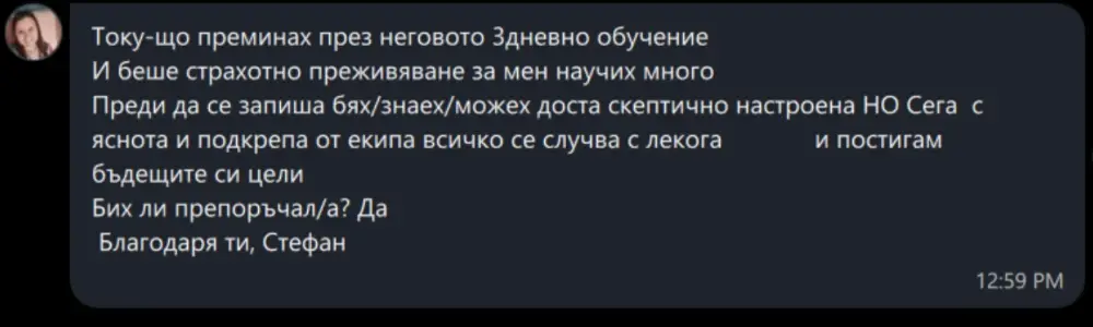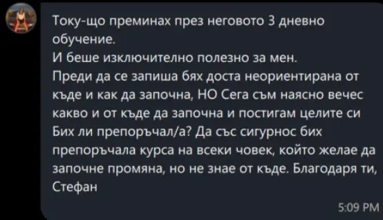 Току-що преминах през неговото вдъхновяващо обучение и беше полезно. Преди да се запиша, бях несигурен, НО сега съм по-уверен и постигам целите си. Бих ли препоръчал/а? Със двете ръце! 👍💪 Благодаря ти, Стефан.