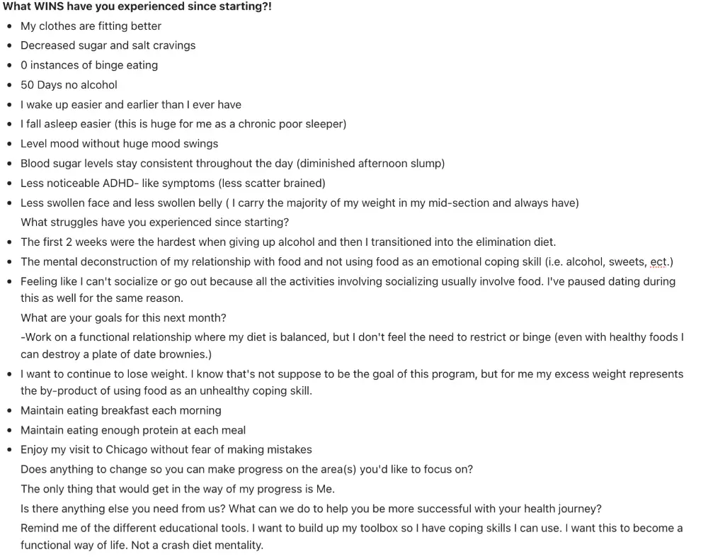 Everything you provided was perfect :) Before the program, my cycle was completely haywire as I am In perimenopause and have PCOS, but after about 2 months in my period went back to 26-28 day cycle with minimal PMS, or cramping, pain, bloating during periods and 7 day bleed vs 10-14 days every 3 weeks! So this alone is huge and even after big personal experiences that put me under more stress my period stayed consistent! My energy is up and more consistent throughout the day which was a big one for me since exhaustion with Hashimotos can be so terrible and I feel more like myself again! I felt my inflammation go down as my skin cleared up And wasn’t having bloating issues! I feel like my immune system is boosted also as I’ve not gotten sick even during international travel as that’s typically the case for me and my oof is more even during my cycle too! So much has improved over the last few months it’s kind of crazy! In the best way! My coach Andi has been amazing and so supportive. I feel so grateful and lucky to have had her by my side!