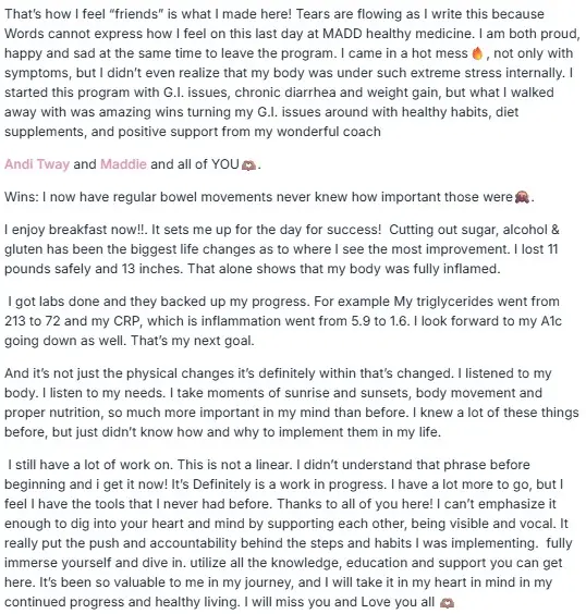 That's how I feel “friends” is what I made here! Tears are flowing as I write this because Words cannot express how I feel on this last day at MADD healthy medicine. I am both proud, happy and sad at the same time to leave the program. I came in a hot mess 🔥, not only with symptoms, but I didn’t even realize that my body was under such extreme stress internally. I started this program with G.I. issues, chronic diarrhea and weight gain, but what I walked away with was amazing wins turning my G.I. issues around with healthy habits, diet supplements, and positive support from my wonderful coach Andi Tway and Maddie and all of YOU🙊. Wins: I now have regular bowel movements never knew how important those were🙊. I enjoy breakfast now!!. It sets me up for the day for success! Cutting out sugar, alcohol & gluten has been the biggest life changes as to where I see the most improvement. I lost 11 pounds safely and 13 inches. That alone shows that my body was fully inflamed. I got labs done and they backed up my progress. For example My triglycerides went from 213 to 72 and my CRP, which is inflammation went from 5.9 to 1.6. I look forward to my A1c going down as well. That’s my next goal. And it’s not just the physical changes it’s definitely within that’s changed. I listened to my body. I listen to my needs. I take moments of sunrise and sunsets, body movement and proper nutrition, so much more important in my mind than before. I knew a lot of these things before, but just didn’t know how and why to implement them in my life. I still have a lot of work on. This is not a linear. I didn’t understand that phrase before beginning and I get it now! It’s Definitely is a work in progress. I have a lot more to go, but I created the tools that I never had before. Thanks to all of you here! I can’t emphasize it enough. We are all here and mind by supporting each other, being visible and vocal. It really helps to have the accountability behind the steps and habits I was implementing. I’m grateful for the push and accountability and the knowledge, dedication and support you can get here. It’s been so valuable in my journey, and I will take it in my heart in mind in my continued progress and healthy living. I will miss you and Love you all 🙊!