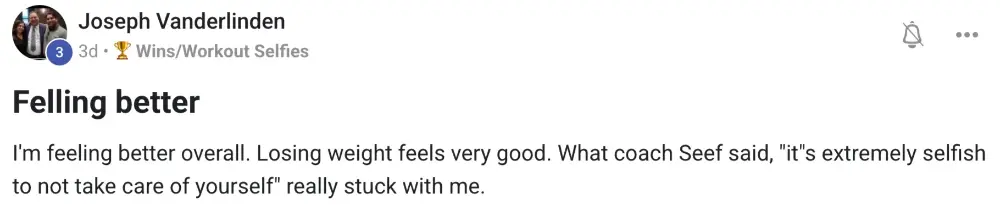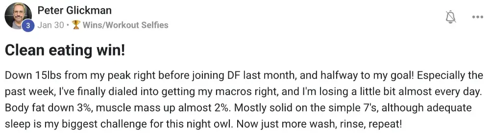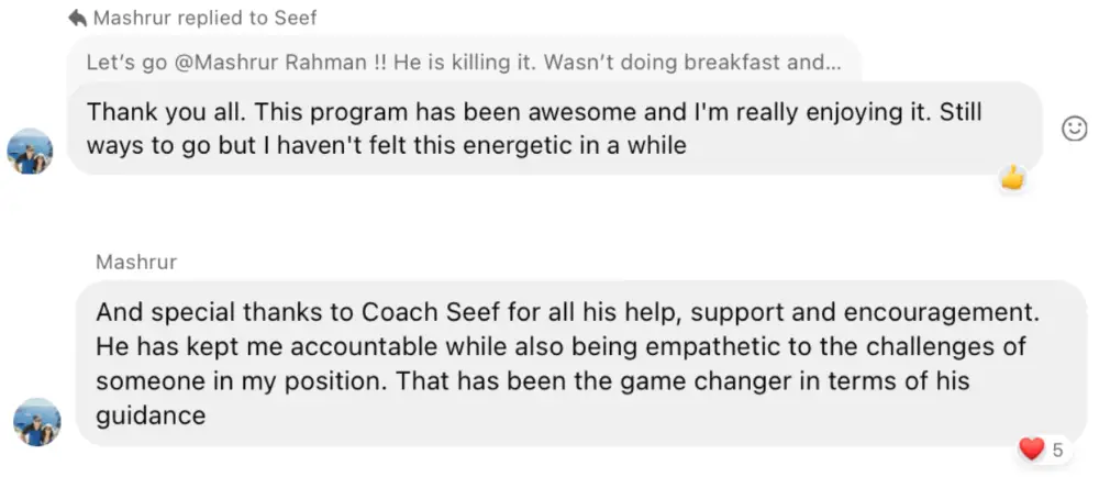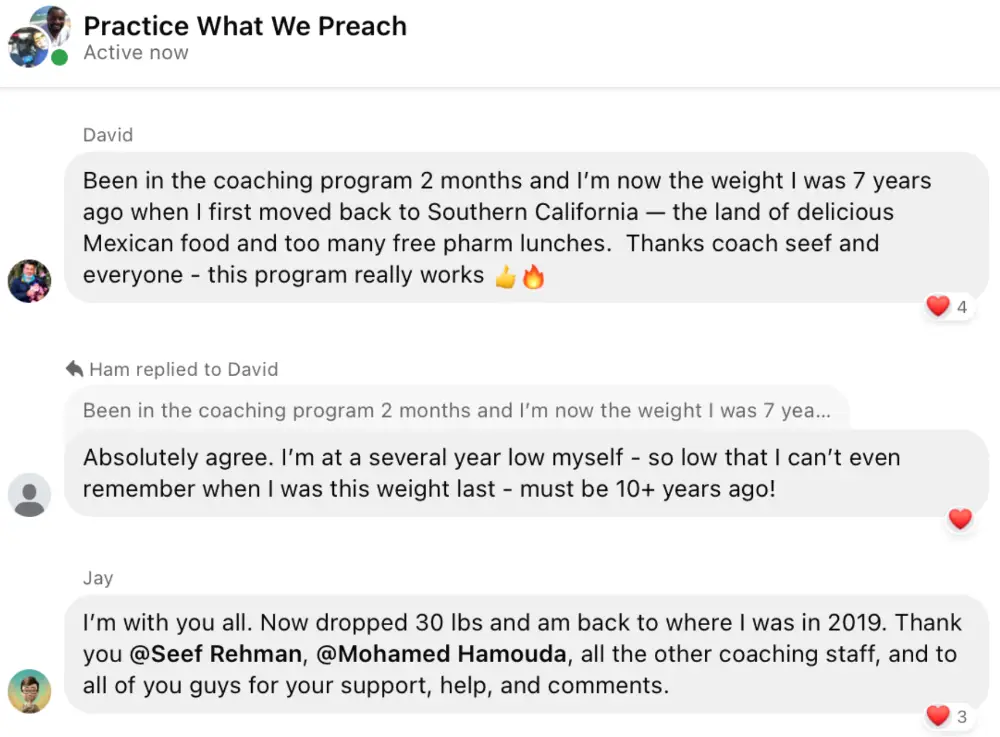 This program and Coach Seef are the real deal! My weight was bouncing up and down for years. Within 6 months of startingthe proram I had lost 22+lbs and 9% body fat. I was back to weight from my University days. It felt liberating. I have maintained this for over a year now and look forward to entering into the next phase of my fitness journey. The secret sauce here is a combination of education, accountability, and psychosocial support. Highly recommend.