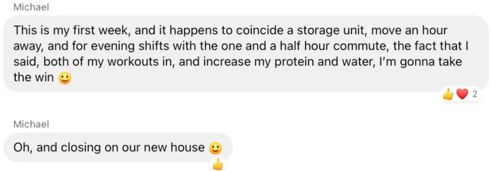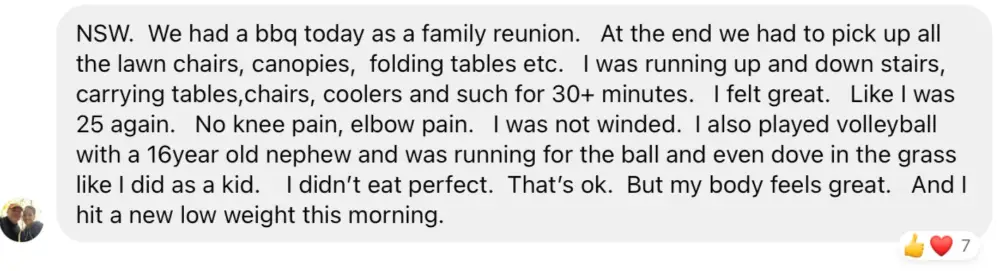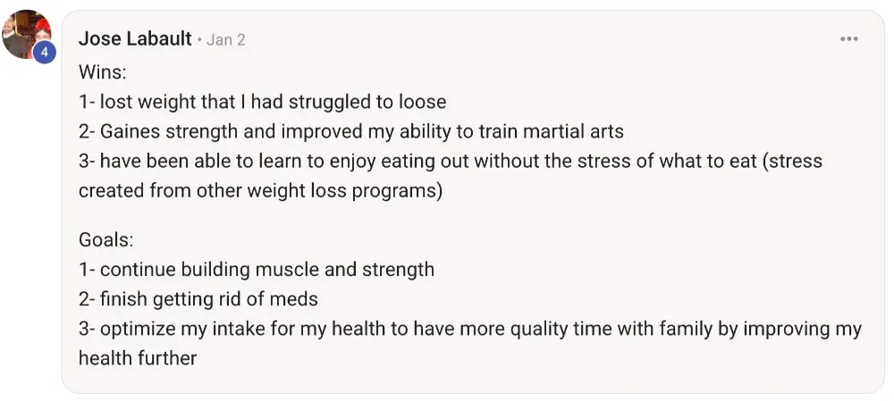 At 60 y/o I had been practicing Cross fit for some years. But could not get rid of those extra pounds to reach a goal. Tried various methods including GLP’s. Simple 7 and coaching helped me get there. It’s been some months and now I find myself maintaining weight and including what I learned on my daily life and my practice. Keep the good work!!!