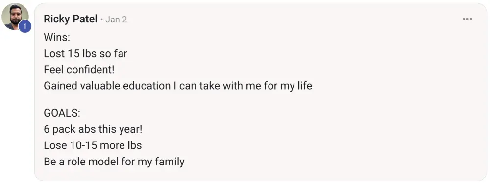 so, through the program, i was not only able to lose weight, i was able to gain muscle, i was able to establish a regular exercise program (which I hated prior to joining!), learned so much about the body/fitness space through the weekly webinars!