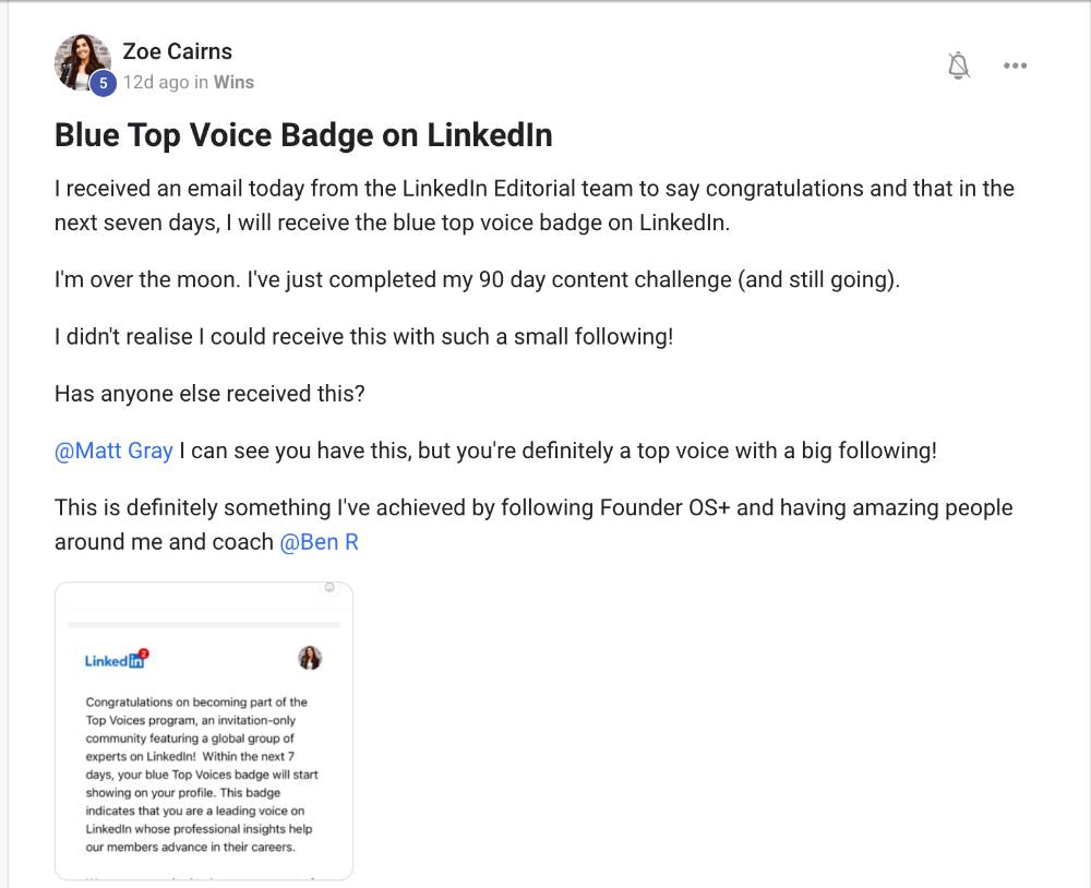 I'm a Growth Marketing Consultant and joined Founder OS to help build systems for my business and grow my audience. Founder OS has been instrumental in helping me breakthrough content blocks, build systems to grow my business, and connect with other incredible legends. The program has given me proven systems to build my audience online and content flywheel (the 60 Day Content Challenge was great to help kickstart things). My favourite part is the community. I've connected with so many other like-minded individuals and Matt is always super responsive and helpful. I've learned a lot from others: whether it's advice on getting new business, offer creation, or tips to manage work-life balance. Plus, Matt is always adding new content to the community so the value of the program only increases. I would suggest the Founder OS Program to any entrepreneur looking to scale their business with tried-and-true systems.