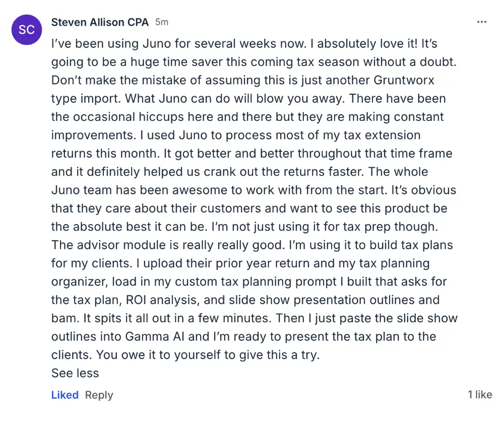 "Juno turned a mediocre tax preparer at our firm into an efficient reviewer. Another employee is now knocking out 8-10 returns a day using Juno."