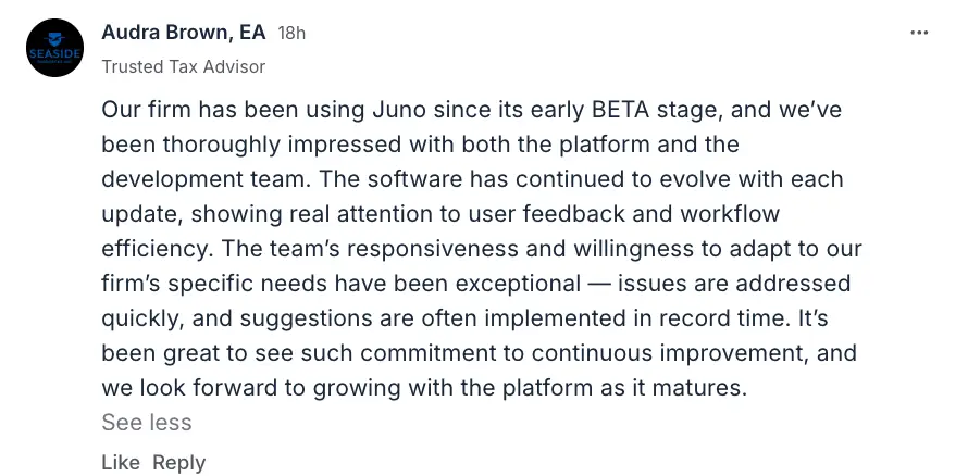 Grant Lacy, Jack Flitcroft, and Daniel Leskiewicz have been amazing listeners on what the industry needs from reliable tax prep software! The Juno team are true innovators!