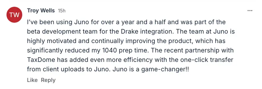We will be implementing Juno this coming tax season. It will improve the product we provide for our clients, and also cut out all the OT. We are PUMPED!!!