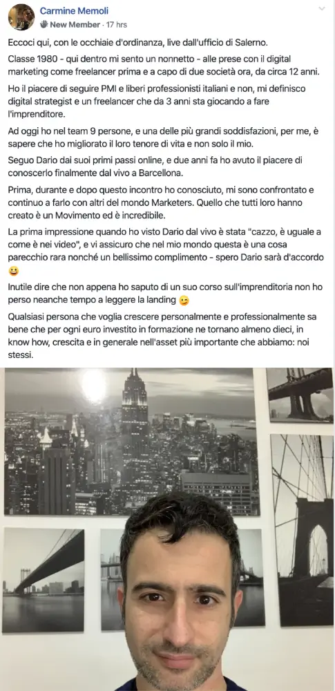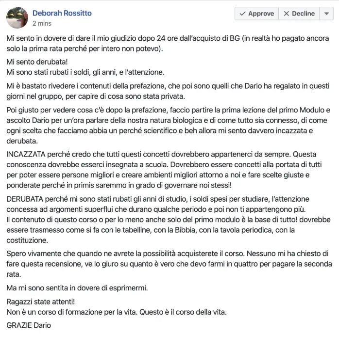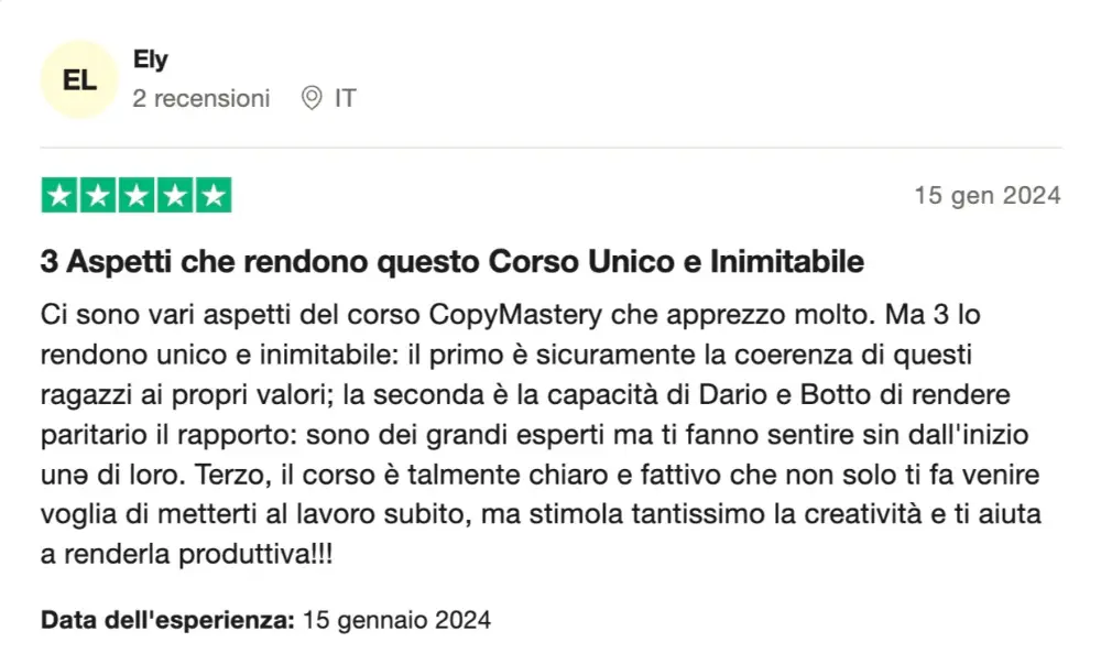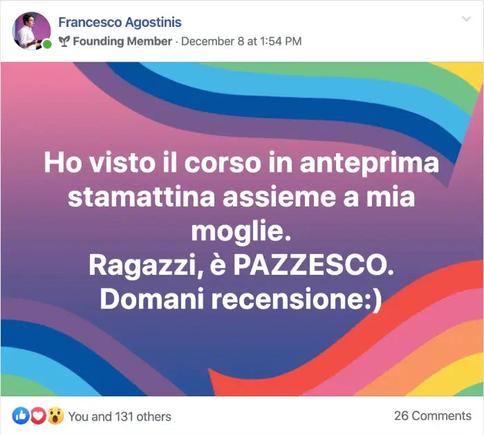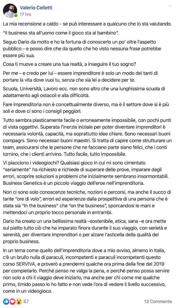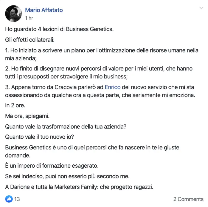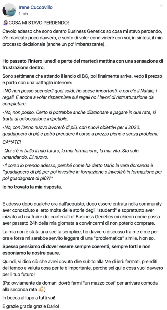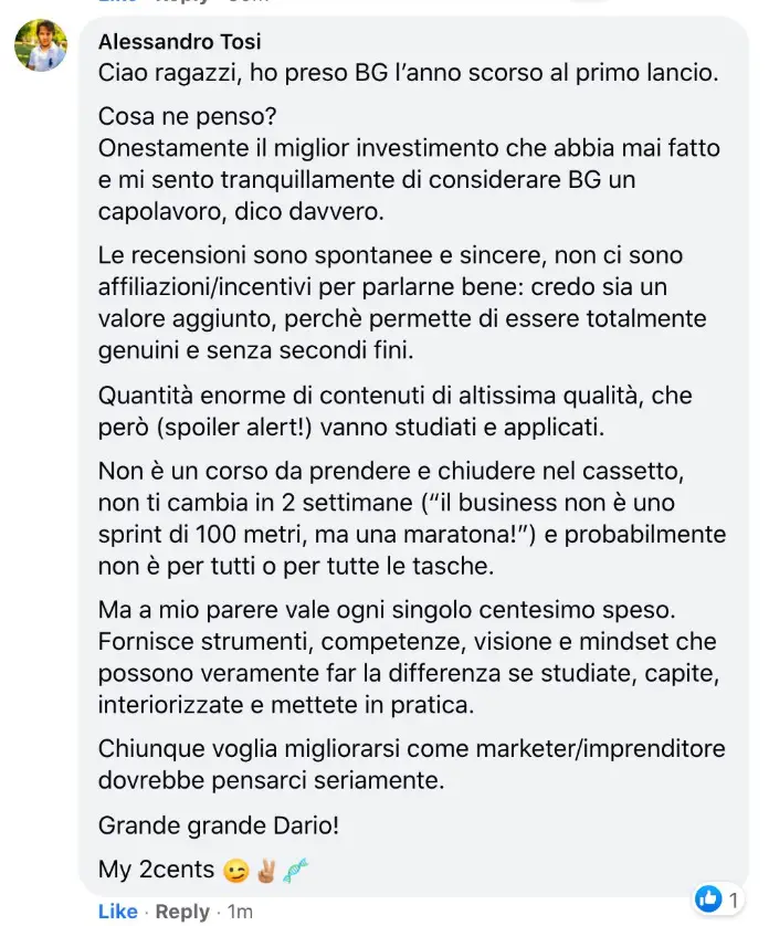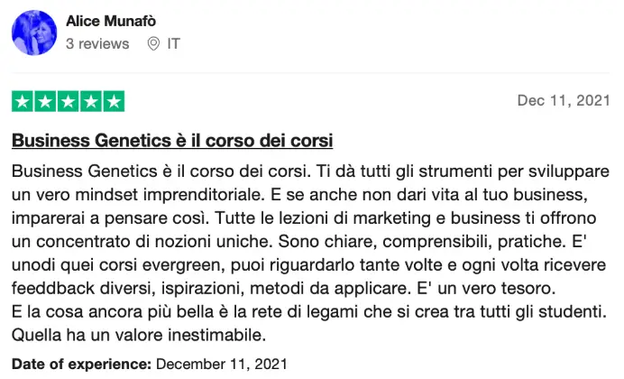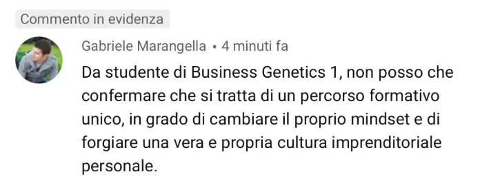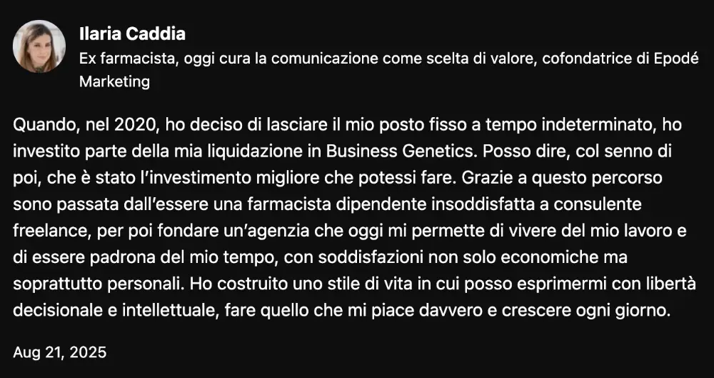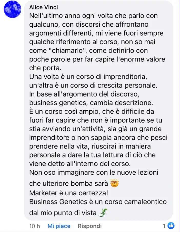 Ho acquistato BG nel novembre del 2021, appena un mese dopo aver lasciato un lavoro a tempo indeterminato che odiavo. Business Genetics è stato il mio primo vero investimento nel mondo del digital marketing, e posso dire che mi ha letteralmente aperto un mondo. Non è solo un corso tecnico, ma un percorso che unisce concetti profondi e riflessioni personali a strumenti concreti e pratici.