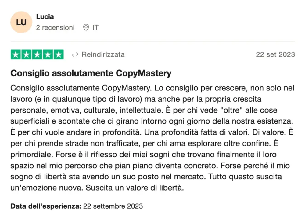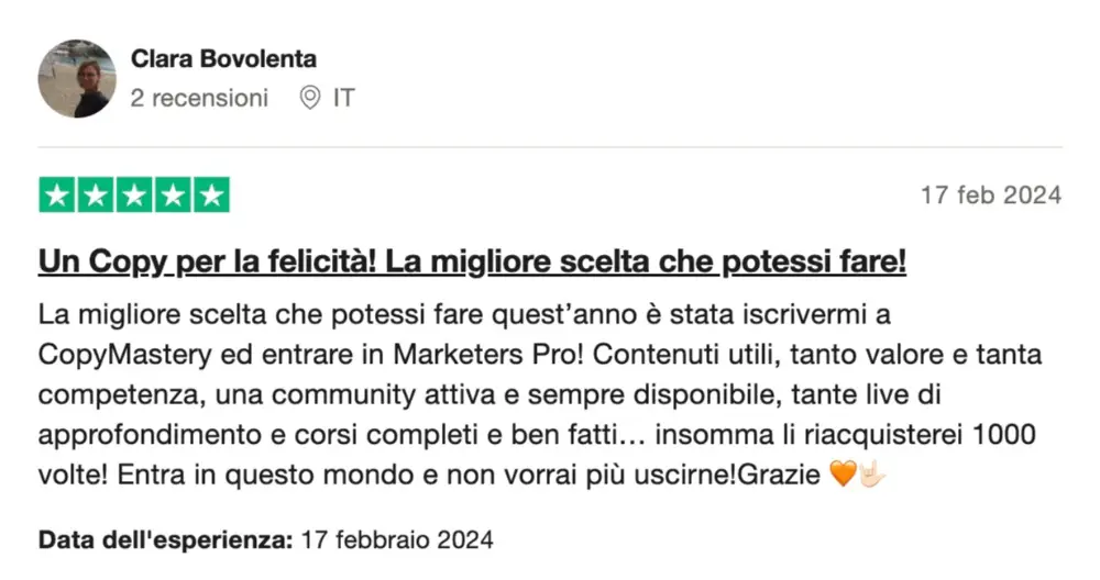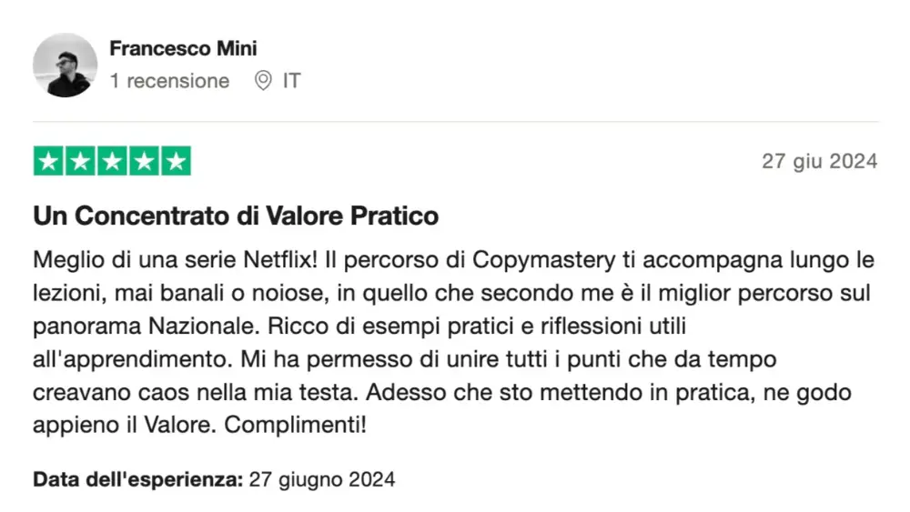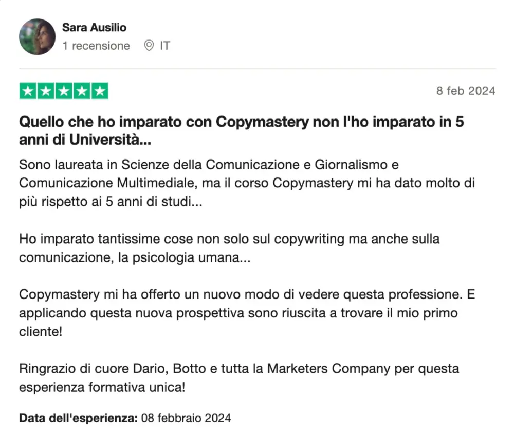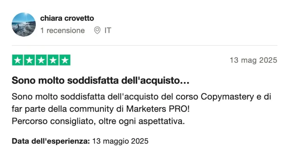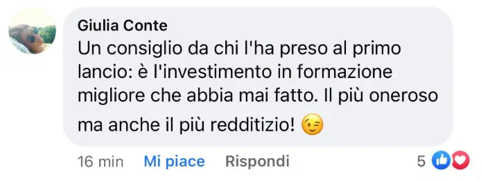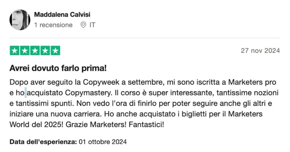 Partecipare a Business Alchemy è stata, senza dubbio, una delle decisioni più strategiche e trasformative per la mia crescita imprenditoriale. Ero alla ricerca di informazioni concrete e di strumenti pratici per scalare il mio business. Avevo molte idee, ma mi mancava la chiarezza necessaria per metterle in ordine e trasformarle in azioni efficaci. Business Alchemy mi ha fornito esattamente ciò di cui avevo bisogno: una guida chiara e strutturata, insieme a strategie immediatamente applicabili. La qualità delle informazioni è stata straordinaria, e il numero ristretto di partecipanti ha reso l’esperienza ancora più preziosa. Ho potuto confrontarmi direttamente con il team di Marketers, che ha condiviso con grande generosità le proprie conoscenze ed esperienze, senza riserve. Inizialmente temevo si trattasse di una semplice presentazione finalizzata a vendere ulteriori servizi, ma non avrei potuto essere più lontana dalla realtà. Grazie a Business Alchemy, ho finalmente trovato la direzione e gli strumenti per far crescere il mio business in modo concreto e sostenibile. Se stai cercando un programma che offra valore reale e supporto pratico, questo è l’investimento che ti consiglio senza esitazione.