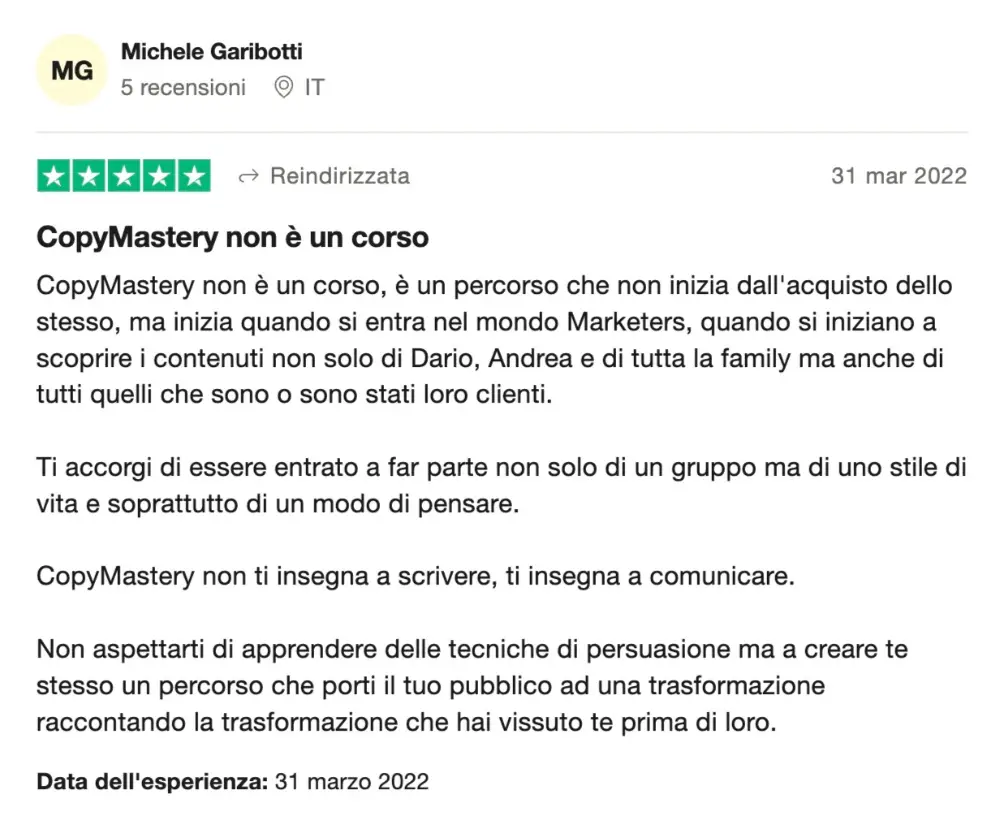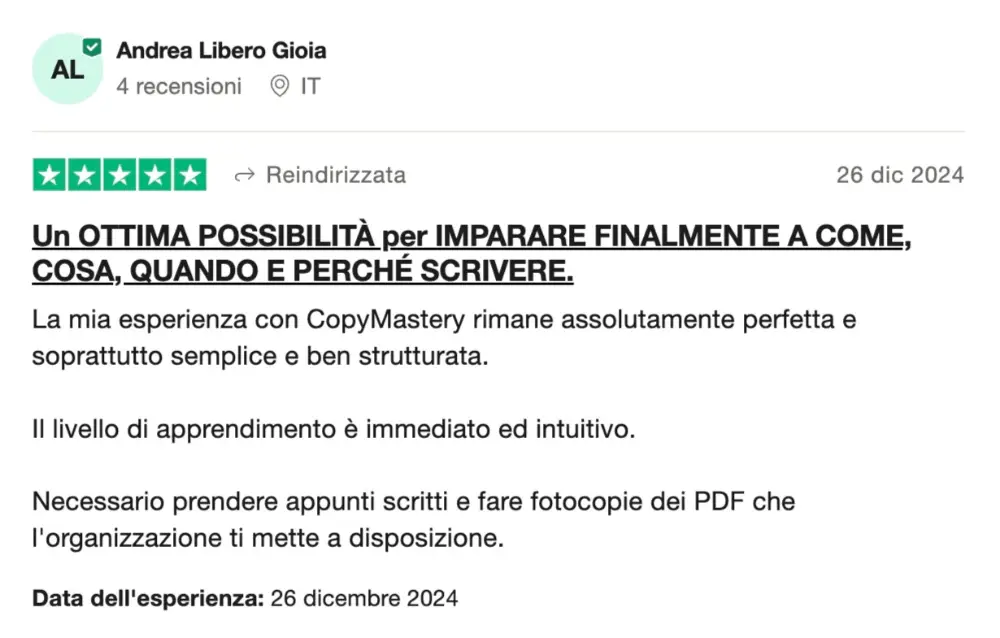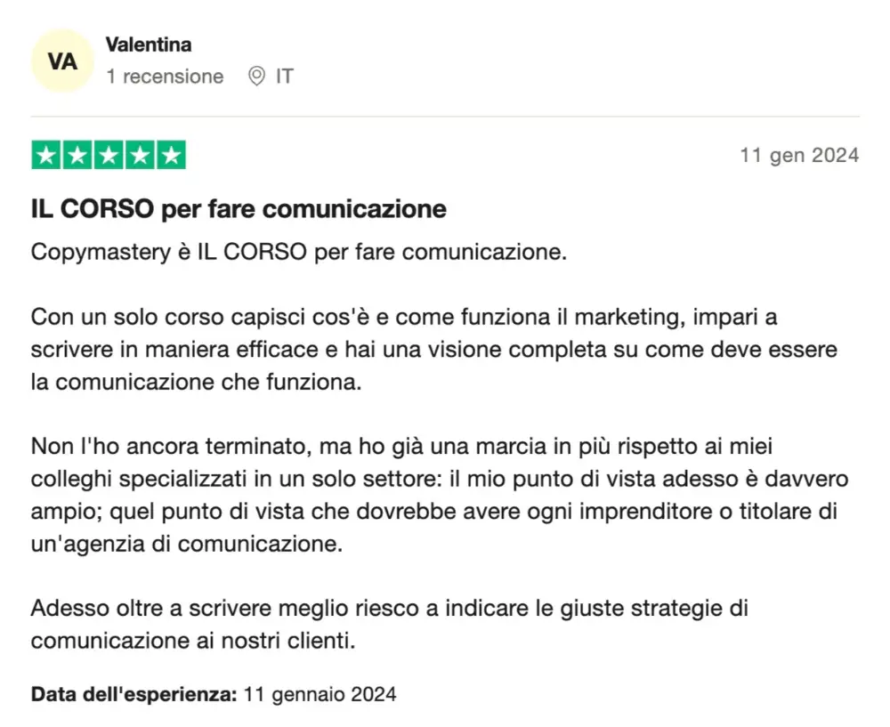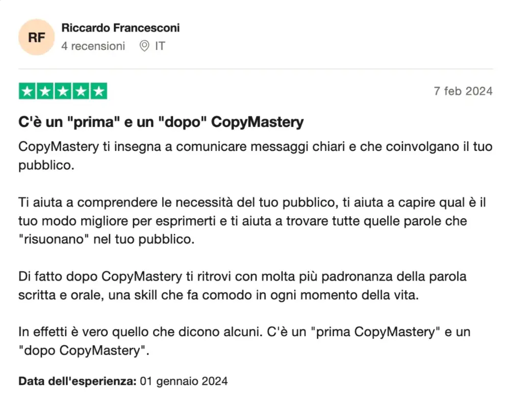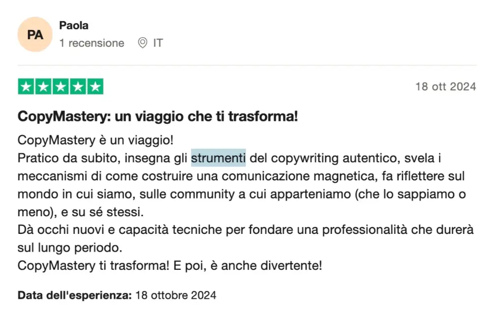 Partecipare a Business Alchemy è stata, senza dubbio, una delle decisioni più strategiche e trasformative per la mia crescita imprenditoriale. Ero alla ricerca di informazioni concrete e di strumenti pratici per scalare il mio business. Avevo molte idee, ma mi mancava la chiarezza necessaria per metterle in ordine e trasformarle in azioni efficaci. Business Alchemy mi ha fornito esattamente ciò di cui avevo bisogno: una guida chiara e strutturata, insieme a strategie immediatamente applicabili. La qualità delle informazioni è stata straordinaria, e il numero ristretto di partecipanti ha reso l’esperienza ancora più preziosa. Ho potuto confrontarmi direttamente con il team di Marketers, che ha condiviso con grande generosità le proprie conoscenze ed esperienze, senza riserve. Inizialmente temevo si trattasse di una semplice presentazione finalizzata a vendere ulteriori servizi, ma non avrei potuto essere più lontana dalla realtà. Grazie a Business Alchemy, ho finalmente trovato la direzione e gli strumenti per far crescere il mio business in modo concreto e sostenibile. Se stai cercando un programma che offra valore reale e supporto pratico, questo è l’investimento che ti consiglio senza esitazione.