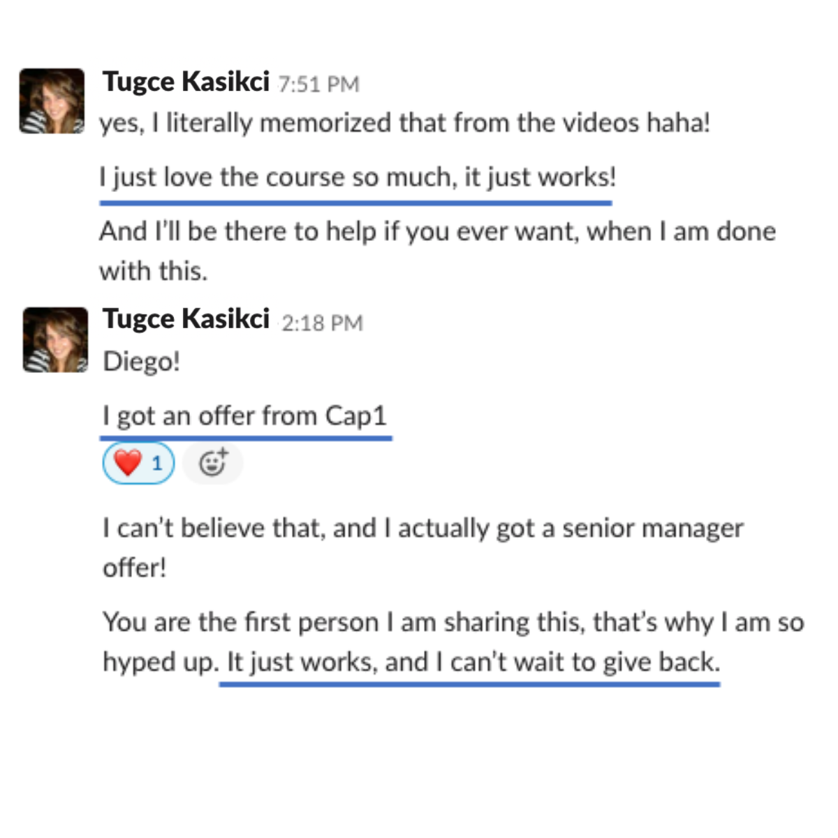 I’m joining Atlassian as part of their APM program. This course has been paramount throughout my interview process and has allowed me to demonstrate my abilities in my interviews eloquently and with poise. Thank you so much Diego and I wish everyone the very best in their interview journeys!!