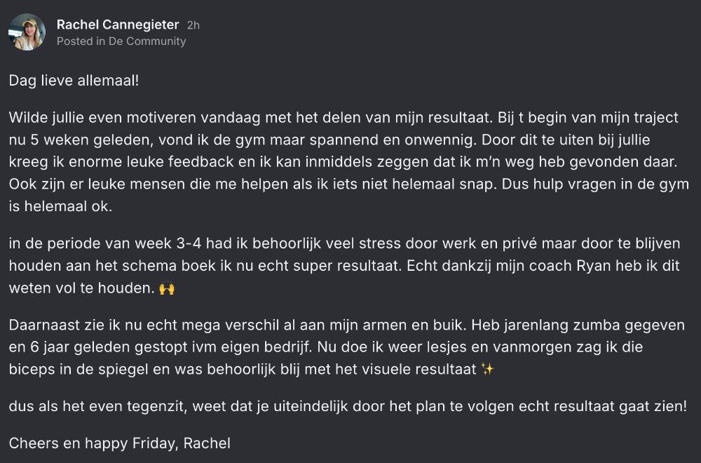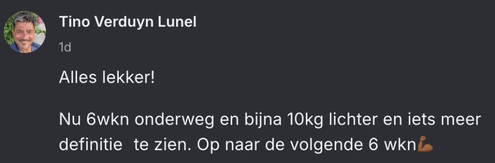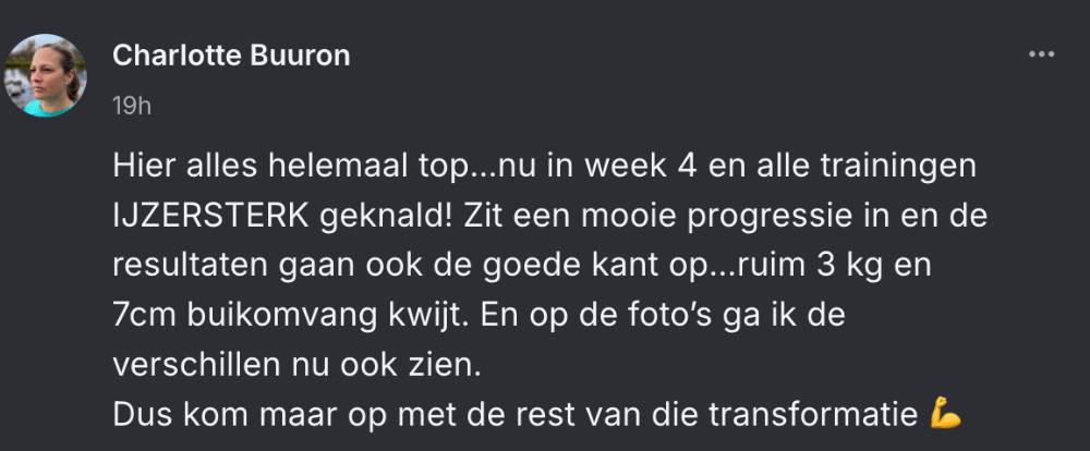 Na een aantal tropen jaren als ondernemer heb ik mijn leven opnieuw vormgegeven. Een onderdeel van mijn leven zat mij al langere tijd enorm in de weg en dat was mijn fysieke shape. Ik ben sportief, doe mijn (kracht) trainingen in de gym en cardio buiten, maar toch was ik te zwaar. Ik deed maar wat in de gym. En at de helft van de week goed en de andere helft van de week te veel en niet de juiste producten. Project IJZersterk heeft een simpele belofte: volg het aangeboden plan en je gaat gewicht verliezen en dat is precies wat er is gebeurd: Ik ben van 103kg naar 89kg gegaan in 24 weken. Mijn buikomvang ging van 114cm naar 87cm. Ik heb op de goede dagen zelfs iets dat lijkt op een sixpack. Ik kan me niet herinneren dat ik ooit in deze shape heb gezeten. Zelfs niet in mijn tienerjaren toen ik 5 dagen in de week intensief sportte. Ik ben soepeler geworden, heb minder pijntjes in gewrichten en spieren . Ik ben energieker en zie er ook jonger uit dan aan de start van het programma (zeggen anderen 😅). Mijn kleding zit beter. Maar, de grootste winst zit in de bewustwording dat je je leven in een half jaar volledig anders kunt vormgeven met een goed doordacht plan en wilskracht. Project IJzersterk geeft je de juiste houvast en structuur voor een fysieke én mentale metamorfose. Is het makkelijk, nee! Dat zeker niet. Maar, je krijgt professionele ondersteuning. In mijn geval van de meest energieke (sport)professional die ik ooit heb ontmoet: Kirsten van den Berg. Ongekend knap hoe iemand op basis van data, foto’s en je eigen feedback jouw progressie foutloos analyseert. Mijn enige twijfel over dit traject zat dan ook in het online karakter. Mede door haar enthousiasme en concrete tips voelde het alsof ze fysiek aanwezig was en mij vanaf de zijlijn aanmoedigde. Voor iedereen die échte verandering wil in zijn leven kan ik Project IJzersterk van harte aanbevelen. Het is het mooiste cadeau dat je jezelf kunt geven.