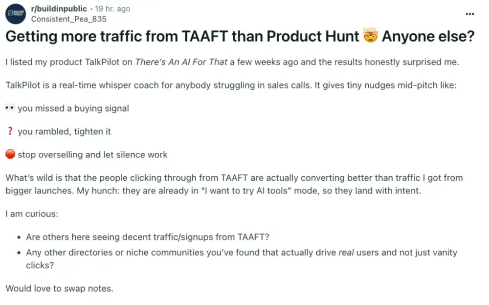 I listed my app on There is an AI for that and got lots of traffic from it! In fact, it was one of the top 5 sources of traffic before I sold it!
