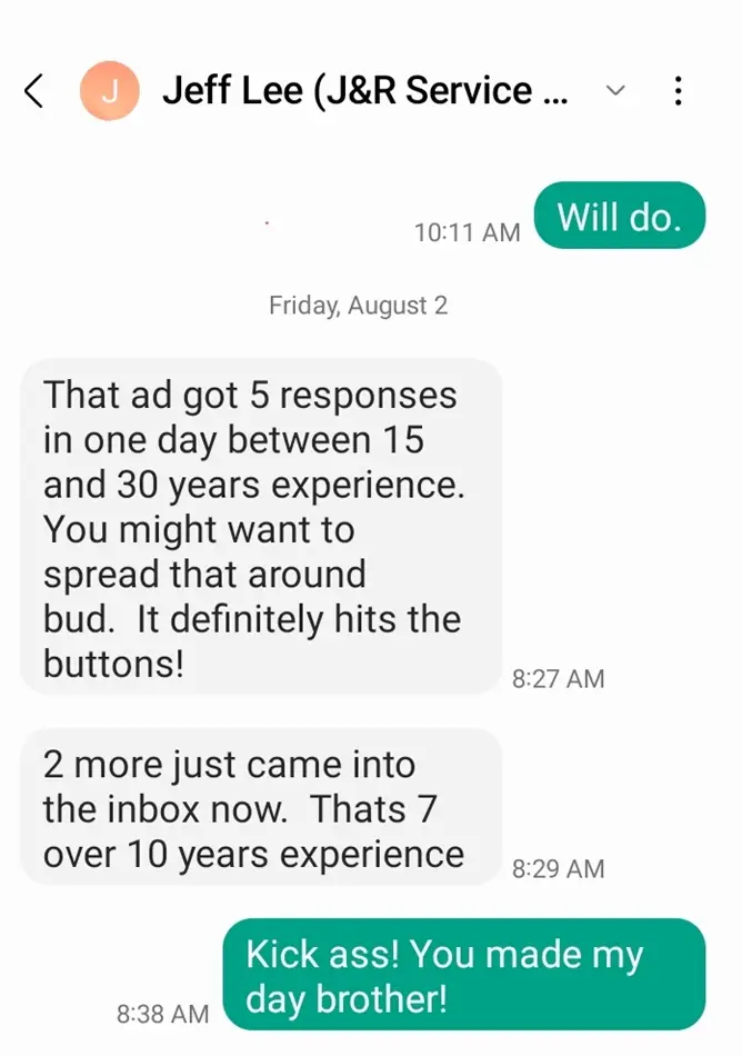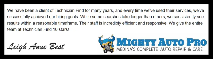 What a difference the ads from Technician Find are making in my hiring process! Chris Lawson and his team do a fantastic job getting to know me, my shop culture, and what I am looking for in a technician. Then they write a perfect ad!! I have hired two techs in the last three months based on the ads that Technician Find has created and posted for me. I am probably getting fewer applicants (which is great!) – but much more qualified than I am used to seeing. Our most recent hire had been the lead tech at a shop nearby for 11 years. Her resume, skill set, interview and references were off the chart fantastic! One of the best techs I have ever interviewed. She had dozens of shops pursuing her – or at least dozens of shops advertising to her on Indeed. She said to me – “Your ad absolutely stood out from all the rest! Your shop sounds like a great place to get your car fixed – and an even better shop to work for!” Thanks Chris and the team at Technician Find for helping me stand out!!